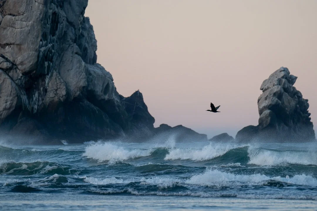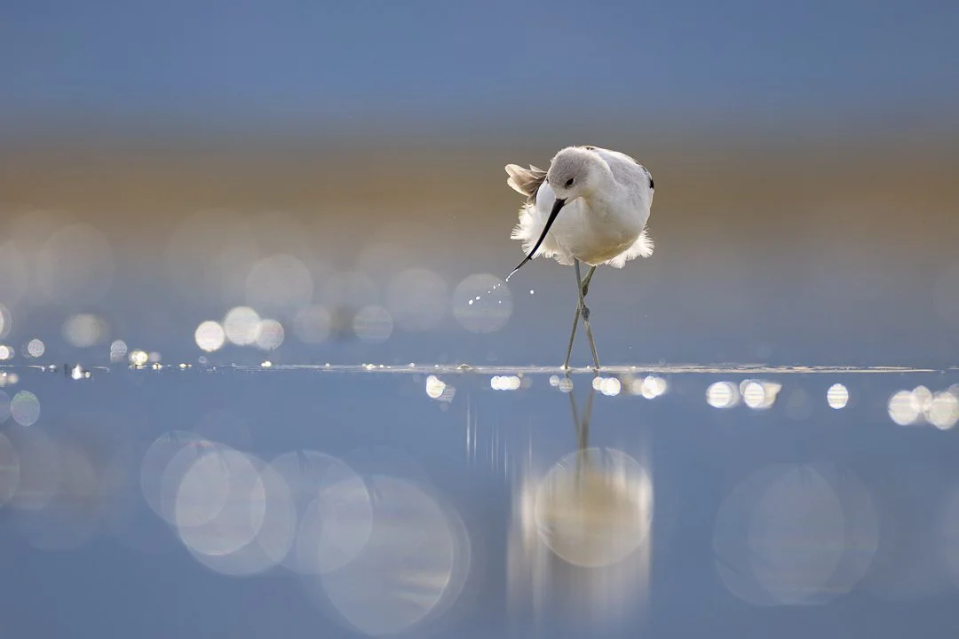 An American Avocet standing on water with a reflection, with a blurred background and bright bokeh light reflections on the water.